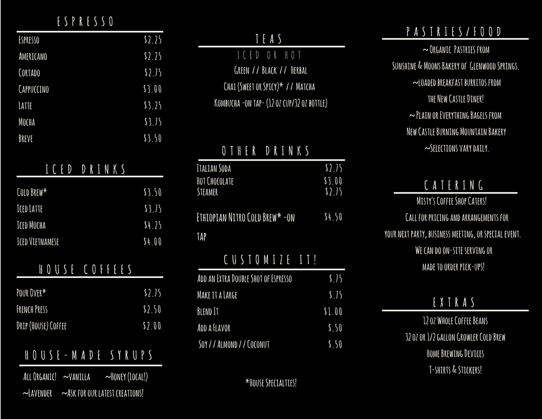 Introducing the menu at Wild Coffee in Silt is a delightful experience that captures the essence of this charming coffee shop. Located at 704 Main St, Silt, CO, this establishment offers a wide array of handcrafted beverages, each crafted with precision and care. Patrons can indulge in classic espresso drinks such as Americano, Cappuccino, and Latte, or savor the refreshing taste of Cold Brew and Iced Mocha during warmer days.
